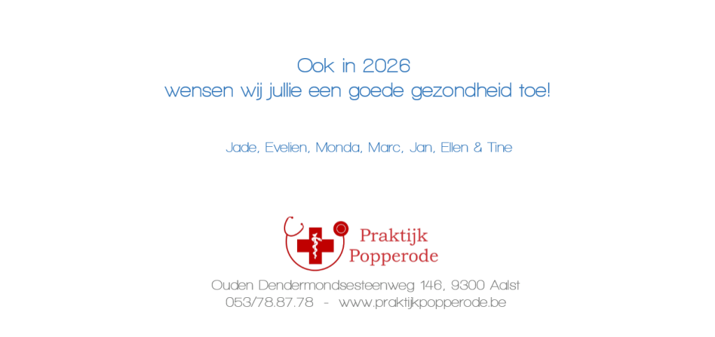 De praktijk zal gesloten zijn van woensdag 24/12/2025 12u t.e.m. zondag 28/12/2025 en van donderdag 01/01/2026 t.e.m. zondag 04/01/2026. Tijdens deze dagen kan u terecht op de huisartsenwachtpost (1733). Prettige feestdagen voor al onze patiënten!