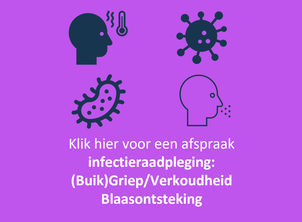 Ben je verkouden of grieperig? Heb je diarree of moet je overgeven? Of heb je een blaasontsteking? Dan kan je een paarse afspraak infectieraadpleging boeken! Zo ben je in drukke perioden vaak sneller geholpen. Klik hier voor meer informatie.